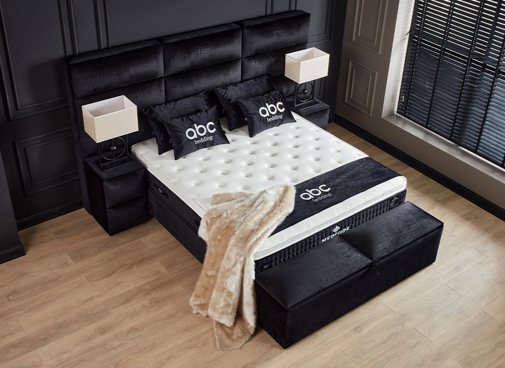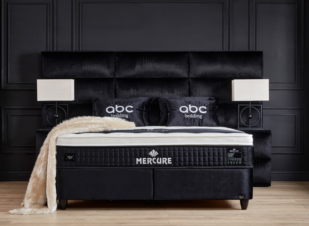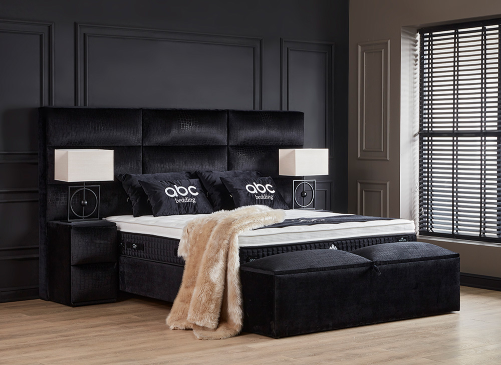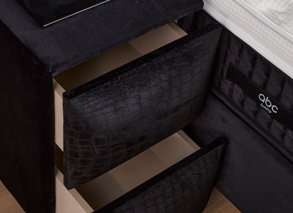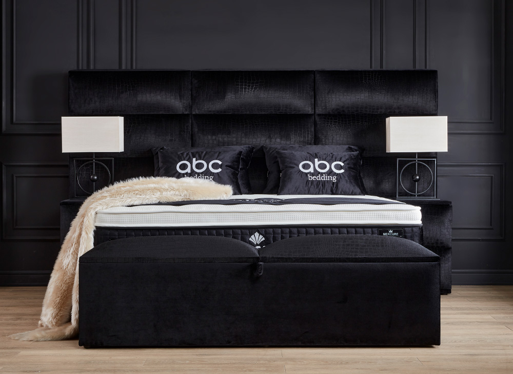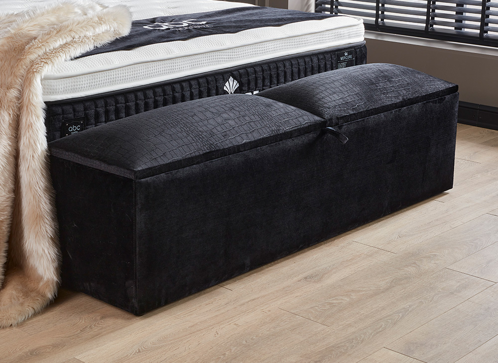 Het opbergbed Mercure van Bedvision is een stijlvol en ruimtebesparend bed met een smart opbergsysteem. Het bed heeft 2 opbergboxen die vanaf het voeteneinde geopend kunnen worden en een handige opbergruimte onder het matras. Het bed is gemaakt van een volledig metalen frame gestoffeerd in een luxe meubelstof en heeft gasveren voor extra gemak bij het openen van de boxen. Het matras is 32 cm dik, voorzien van een 5-slags binnenvering, een afneembare koudschuim topper en is mee gestoffeerd in de luxueuze meubelstof. Het matras is enkelzijdig te beslapen en heeft een belastbaarheid van 100 kg. Het bed is alleen verkrijgbaar in de zwarte kleur en stof met een croco print. Het hoofdbord heeft 9 blokken met een horizontale verdeling en een verticaal gedeelde 3 delen. Levering is beschikbaar door heel Nederland.